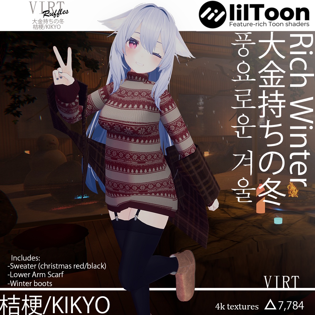 04 dec 22: Updated waist weight painting Includes files: .Fbx Prefab PSD 4KTextures This is a 3D model of Rich winter for "KIKYO" sold by ぽんでろ https://booth.pm/en/items/3681787 この衣装は AvatarTools に対応しています。 Compatible with AvatarTools [ https://kurotori.booth.pm/items/1564788 ] この衣装は【無料】lilToon に対応しています。 Compatible with Liltoon shader [ https://booth.pm/ja/items/3087170 ] 使用条件について * このデータを利用することで、利用規約に同意したことになります。 - 使用条件 - 商用利用。許可 ※本データを着用しているモデルデータが許可している場合に限ります。 - R18コンテンツ。許可 ※本データを着用しているモデルデータが許可した場合に限ります。 - 衣装本体の取り扱いは、各モデルの使用条件に準じます。 - 禁止事項 ・ 二次配布。禁止事項 本コンテンツに添付されているデータの二次配布は、改変されているか否かに関わらず禁止します。正しくは、VketをNPCに変換したい場合にお問い合わせください。 - VRChatのペデスタル化。禁止事項 本データを着用しているモデルが許可されている場合であっても、禁止事項とします。 本人になりすます行為 特定の個人や団体への誹謗中傷を目的とした利用 法令に違反する利用 - 免責事項 このモデルを使用したことによるトラブルや損失は、すべて使用者の責任となります。VIRTは責任を負いません。 Terms of Use: * You agree to the terms of use by using this data* - Terms of use - Commercial use: Permission * Only when the model data wearing this data permits. - R18 Content: Permission * Only when the model data wearing this data permits. - The handling of the outfit on body is in accordance with the terms of use of the model. - Prohibitions ・ Secondary distribution: Prohibition Secondary distribution of data attached to this content is prohibited regardless of whether it has been modified or unmodified. Correct, please contact us if you want to convert Vket to NPC. - VRChat pedestalization: Prohibition Even if the model wearing this data is permitted, it is prohibited. ・ Acts that pretend to be the author ・ Use for the purpose of slander to a specific individual or group ・ Use that violates the law - Disclaimer ・ The user is solely responsible for any trouble or loss caused by using this model. VIRT is not responsible. Producer: VIRT Twitter: @RuffleChannel